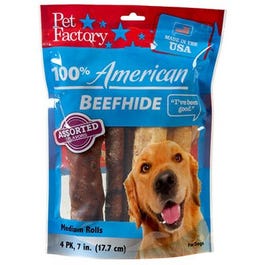 4 pack, American beefhide rawhide rolls dog treat, assorted flavor, 100% made & processed in the usa following strict gfsi food quality standards, full flavor, thicker fibers, longer lasting chew with great American bred taste that will not only satisfy your pets, but also helps promote great oral hygiene by removing tartar & plaque.