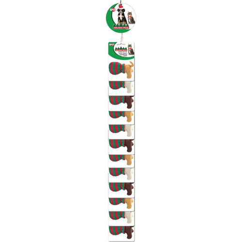 Plush cat in a holiday knit sack. Contains catnip. 3 color assortment.