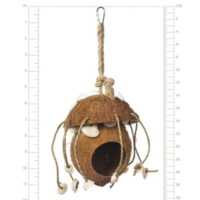 Prevue Pet Products Naturals Coco Hideaway with Shells Bird Toy 62802 is handmade from 100% natural, sustainable, materials providing your bird with mental stimulation and rugged physical play. Made with seashell, natural sisal rope, cotton twine and coconut shell this bird toy encourages beak exercise. Toy connects easily to cage with quick-link attachments and is hand made – actual measurements may vary slightly. As always, supervise birds at play. Our Naturals Coco Hideaway with Shells bird toy is approximately 11 3/8” Long and 5” Wide, ideal for Small to Medium sized birds.